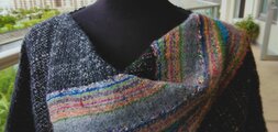 手織りの布から仕立てましたポンチョです。材質はウールです。色合いは縦糸にカラフルな糸を使用していますので真っ黒ではありませんがメインには黒です。胸元で軽くねじてカラフルな細い縞模様が襟もとで出るようにしました。着丈は40センチ、袖は7分。軽い羽織ものとして着ていただけたらと思います。後ろ身頃にはカラフルな縞模様、グレーなど織り入れています。