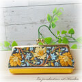 華やかなお花のインド刺繍リボンと、黄色の鮮やかな革を合わせたがま口です。