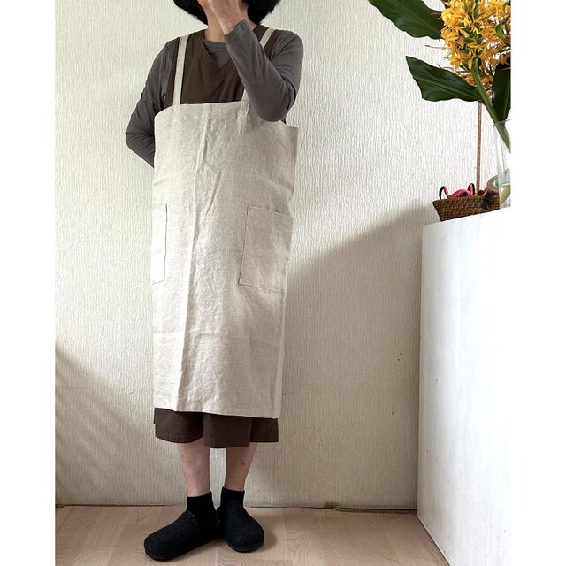SALE 肩ヒモを細くしたバッククロス・エプロン 長さSS リネン・ライトキャンバス