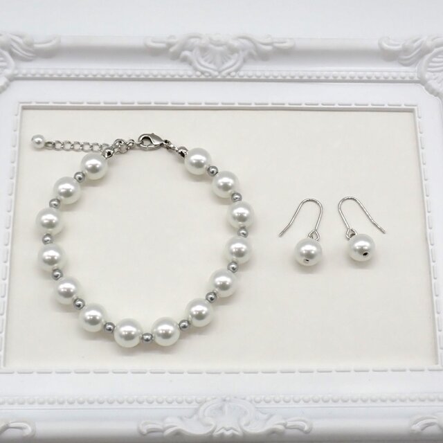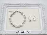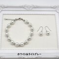 8㎜のパールの間にライトグレーまたはベージュの小さなパールを入れた軽やかなデザインのブレスレットと一粒パールのピアス/イヤリングのセットです。