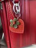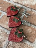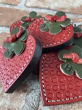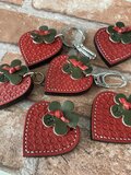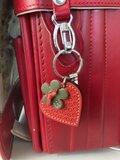 栃木レザーヌメ革を贅沢に表裏に使ったイチゴのキーホルダー(1個 1200円) 革の厚みが5~7mm(革を4~5枚張り合わせています。)あるのでイチゴみたいなボリュームのあるキーホルダーです。裁断面をこげ茶色で染色しています。綺麗なステッチと裁断面のコバ処理(塗装)技術から高級感のある可愛らしい イチゴキーホルダーに仕上がっております。