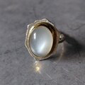 幻想的な白いシーンが美しいムーンストーンを真鍮で石留し飾り枠を施したシルバーリングに仕立てました。