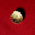 菊のようでコスモスのようでもある、キラキラと黄色に輝く花のブローチ。