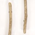 ゆるい湾曲の枝流木、太い方の先あたり湾曲外側側面に削れ、反対側の端の前面にも 木の節が窪んだ削れがございます。