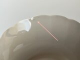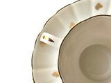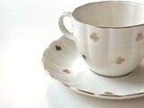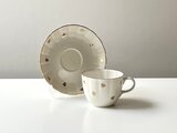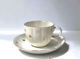 製造段階のものとして、ソーサーの裏側に支柱痕(焼き物がくっつかないように支える丸めた土「支柱」を外した痕)があります。また、古いものなので釉薬のかかりにむらやピンホール状の抜け、微細な釉薬の突起が見られます。特に縁の金彩ににじみが生じているものがございます。