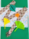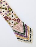 赤やグリーンを中心とした色合いの中に、白や紫の色のモチーフがポップな感じを出しているラリエットです。
