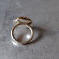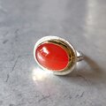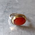 深いオレンジ色が美しいカーネリアンを真鍮のゴールドカラーで留め、飾り枠を施したシルバーリングに仕立てました。