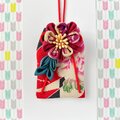 お守り袋の柄にあわせて紐は華やかな王道カラーの赤を使いました