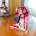 またお守り袋には同じ縮緬生地で作った花をあしらいました