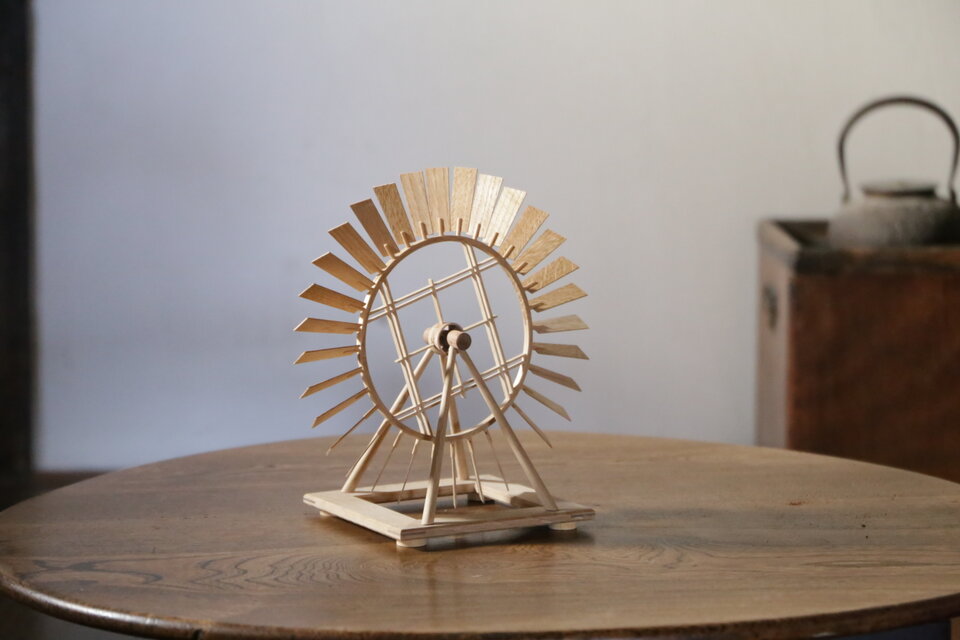 メカニックな風車なのにあたたかい木でできていることに感動しました。お手仕事ってすごい!