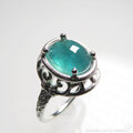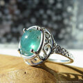 おちついたグリーンのグランディディエライトを、唐草と透かし模様の台座にセットしました。