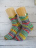 ドイツのブランド Opal Laubgeflüster 11257 Vogelzwitschern で編んだ chiharu.amukoのIDでインスタグラムで活動されている方のレシピでこれからの季節に履いて頂けるよう足首をショート丈に編んだ靴下です。