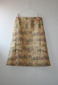 昭和に作られたと思われるウールの着物を丁寧にほどき、洗い、台形スカートを作りました。濃いクリーム色の中にコロンとした木々がデザインされた生地で、脇のコンシールファスナーで脱ぎ着します 。 生地の柄が印象的なので、シンプルなコーディネイトで主役になれるスカートです。丈は膝下想定で少しクラシカルな雰囲気。腰回りはすっきりしています。ブーツでも素敵です。ウール生地ですので夏以外、春、秋冬と着用頂けます。