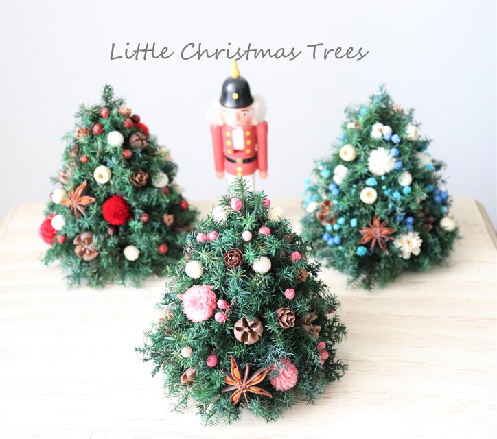 針葉樹に木の実や小花を散らした小さなツリーができました。