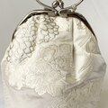柔らかな輝きのシルバー、花々や亀甲模様の華やかで上質な帯でお作り致しましたがま口バッグです。