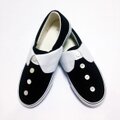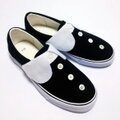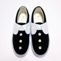 黒のスリッポンに真っ白な丸襟とボタンを縫い付けて、
