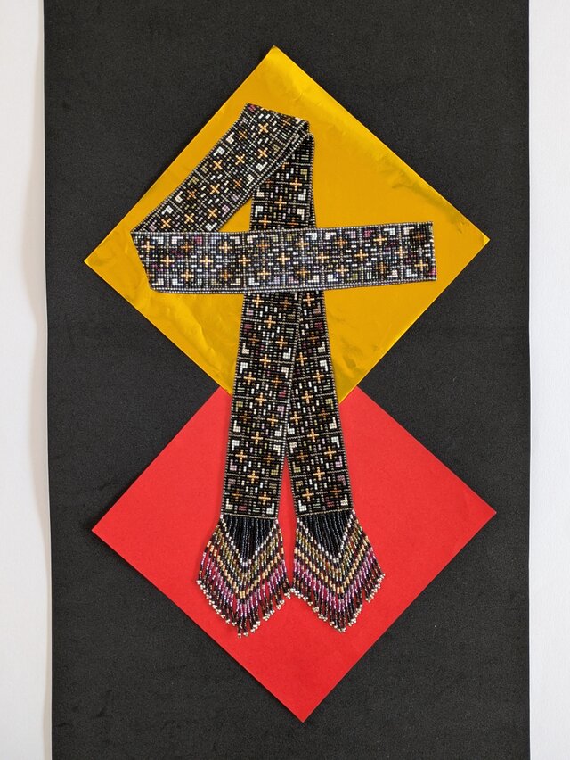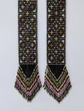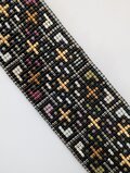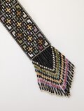シルバー、グリーン、赤などの色を散りばめた幾何学模様のラリエットです。