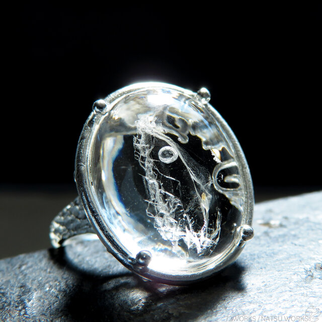 その内部に太古の水分を湛えた水晶を、唐草と透かし模様の台座にセットしました。
