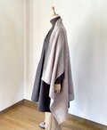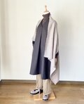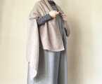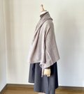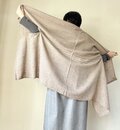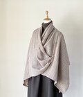 手の通し口がありますので、手首だけ通して広げて肩にはおったり、肘まで通して着るとベストのようになりますし、たっぷり二重に巻いて首周りにボリュームを持たせたりと 様々な着方が楽しめる おしゃれな大判のストールです。