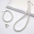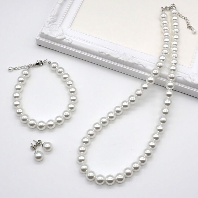 8㎜のホワイトパールのシンプルなデザインのネックレス・ブレスレット・一粒パールのスタッドピアスの3点セットです。
