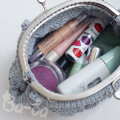 ライトグレーの糸を透かし模様で編み上げ、がま口に仕上げました。