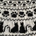 遊びに使うヒモとボールからイメージした模様と、足跡、黒猫を編み込みました。