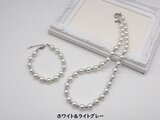 8㎜のパールの間にライトグレーまたはベージュの小さなパールを入れた軽やかなデザインのネックレスとブレスレットのセットです。