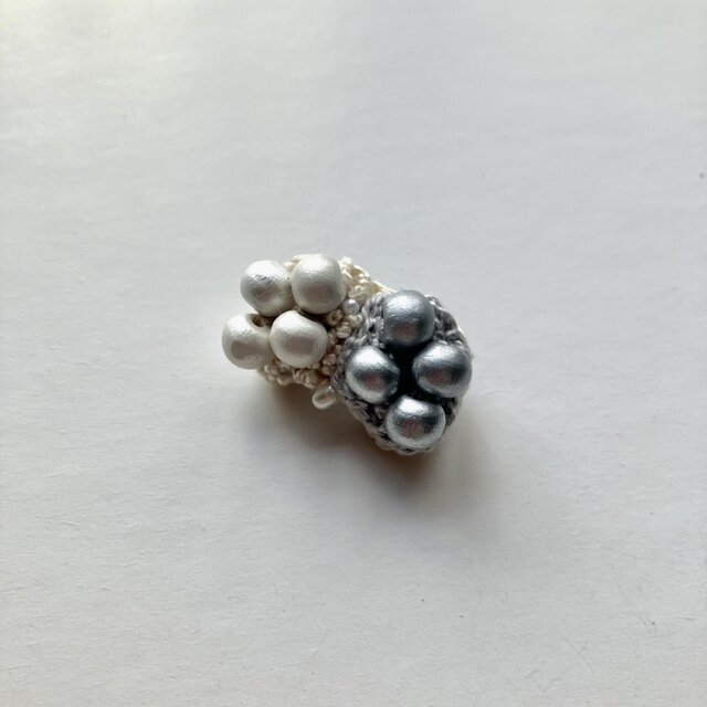 ベージュ、グレーなど大人でシンプルな色合いのブローチは秋冬の彩りのあるコーディネートのワンポイントに。