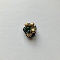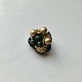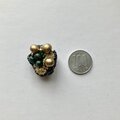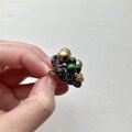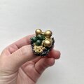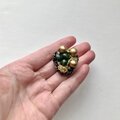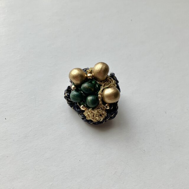 ブロンズカラーの大きめのウッドビーズとちいさめのグリーンのウッドビーズを中心に金糸と輝きのある黒と金色の糸を使いシックなブローチに仕上げました。
