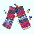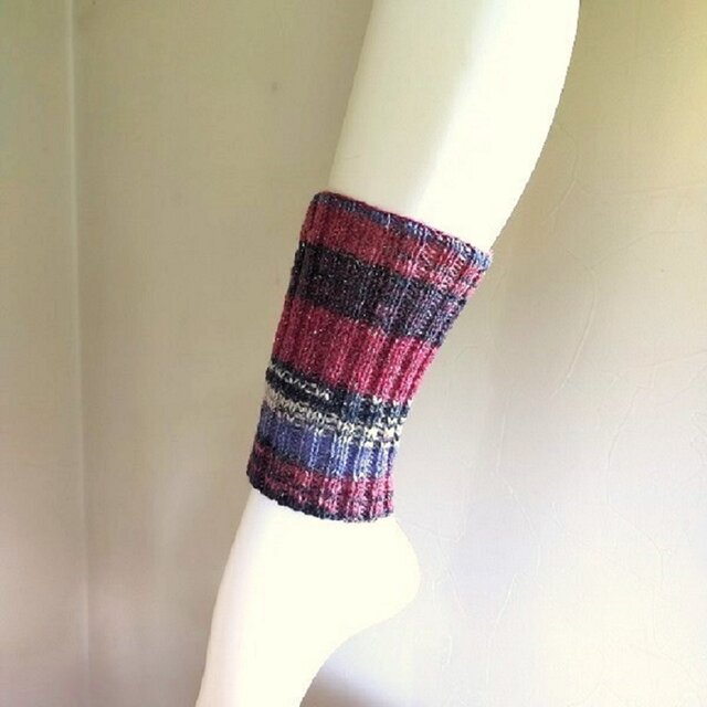 フランボワーズ、レイズン、ブルーなど落ち着いた染めの毛糸でレッグウオーマーを編みました。