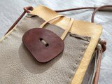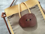 開口口は、革紐を大きなボタンに掛けて留めてください