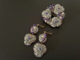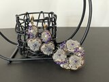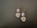 草木染ビーズでスミレの刺繍をして、涙型のビーズを散りばめたピアスにしました