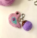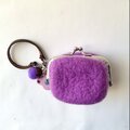 手のひらサイズの球体の羊毛フエルトがま口で、バックの外付けができるタイプです。