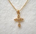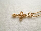 クロスチャームはミル打ち模様と透かしの優しい形にキュービックジルコニアのストーンがはめ込まれており小さいながらも高級感があります。
