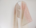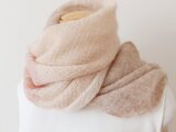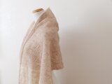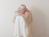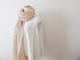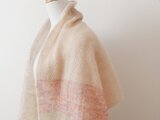色の異なる数種類のベージュ系モヘアの糸をブロックのように組み合わせたニットのストールです。