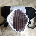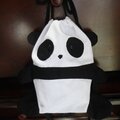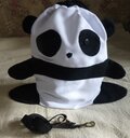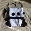 パンダの形の巾着バッグです。巾着の紐は肩からかけられるように長めにしてますが、付属のショルダー紐を使う場合は巾着紐が長すぎるかもしれませんので、お好みの長さで切ってご利用ください。手の裏側にDカンを付けていますので、付属のショルダー紐を取り付ければショルダーバッグとしてご利用いただけます。(ショルダー紐をご利用の場合は頭部を少し後ろ側に折っていただくと使いやすいです。)