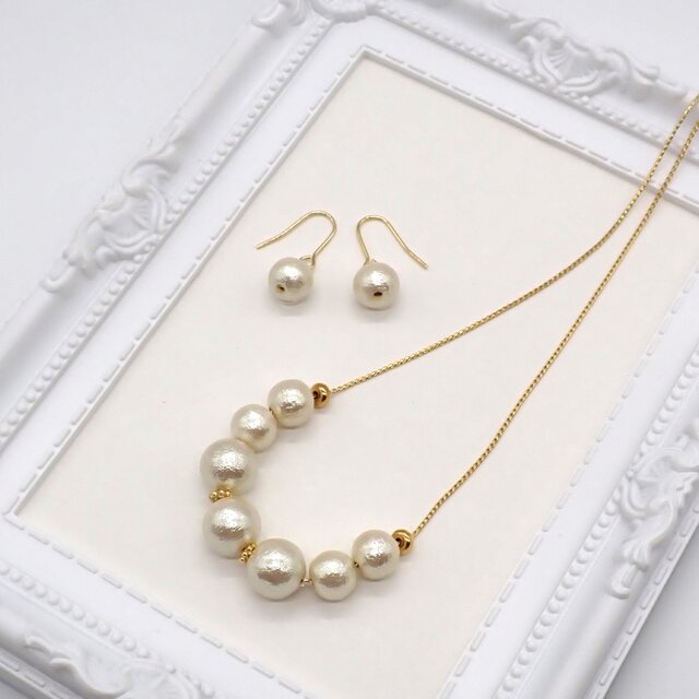 コットンパールを細いチェーンに通してデコルテ部分に並べたシンプルなデザインのネックレスと一粒パールのピアス/イヤリングのセットです。