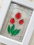 光が当たると、色合いやデザインが優しく反射し、見るたびに新たな楽しみをお届けします。サイズは縦約12cm・横約16cm程度で、ガラス絵の具を使用した薄いアクリルに赤いチューリップが描かれています^^