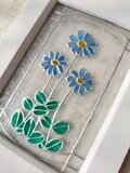 光が当たると、色合いやデザインが優しく反射し、見るたびに新たな楽しみをお届けします。サイズは縦約12cm・横約16cm程度で、ガラス絵の具を使用した薄いアクリルに、ブルーデージーが描かれています^^