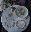 作品をお送りいただきありがとうございます。オパールのネックレスの遊色があまりにも綺麗で、虹色に輝いていてとても感動しました。アクアマリンのピアスも色のグラデーションが美しく、小さな石が揺らめく様子がとても軽やかで素敵です。大切に使用させていただきます。