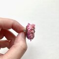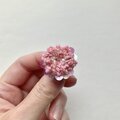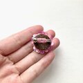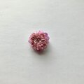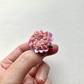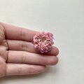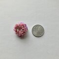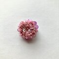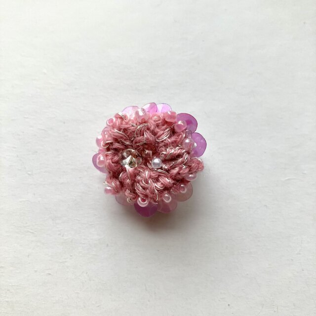やわらかなピンク色の糸を編み、ピンク色のインポートビーズと合わせ、中央にはシルバーラインの入ったビーズと一粒の小さなパールビーズをつけた小さく優しい印象のあるブローチです。周りには