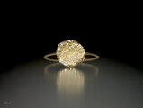 細かなテクスチャーが施された中心部分はランダムな凹状になっており、その周囲をダイヤモンドがセッティングされた不規則な地金で柔らかく包み込んでいるデザイン。