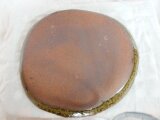 厚さがちょっと厚めの皿です。(1㎝位?)渋いグリーンの地に同じ釉薬を垂らしてます。