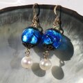 琉球ほたる玉、フレッシュウォーターパール、高級14KGFピアスフックを使った和モダンジュエリー。程よいサイズの12mmガラスビーズから、可愛いパールが軽やかに揺れる和美人ピアスです。ピアスフックには14金ゴールドフィルドを選びました。他のゴールドジュエリーとの相性も抜群。