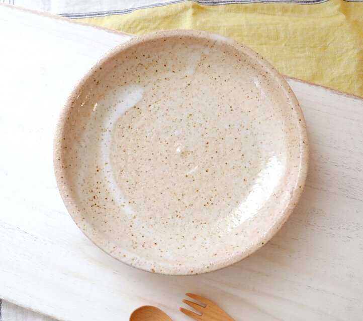 素朴でぬくもりある色彩の藁灰釉と、陶器らしい温かな質感の陶土を組み合わせて制作した深皿です。