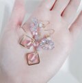 耳元を素敵に魅せてくれるグレーオーロラ色のフラワービーズにキラキラと光るガラスビーズなどを一緒にジャラジャラと合わせ、更に可愛いピンク色のルナフラッシュが真ん中で揺れる少しだけ大きめサイズのスクエアフープを下に配置したお洒落なピアスとなっております☺