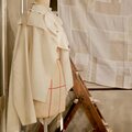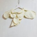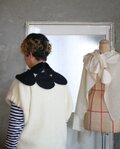 布から卵型のパーツを切り出し、縁をメローロック、のちに各パーツをつなぎ合わせた襟巻きです
