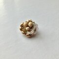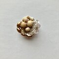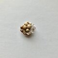 真ん中にはウッドビーズを四つ、側面にはきれいな輝きのある日本の職人さんがつくったブロンズカラーのユリア樹脂パールのお米のような形を四つつけています。