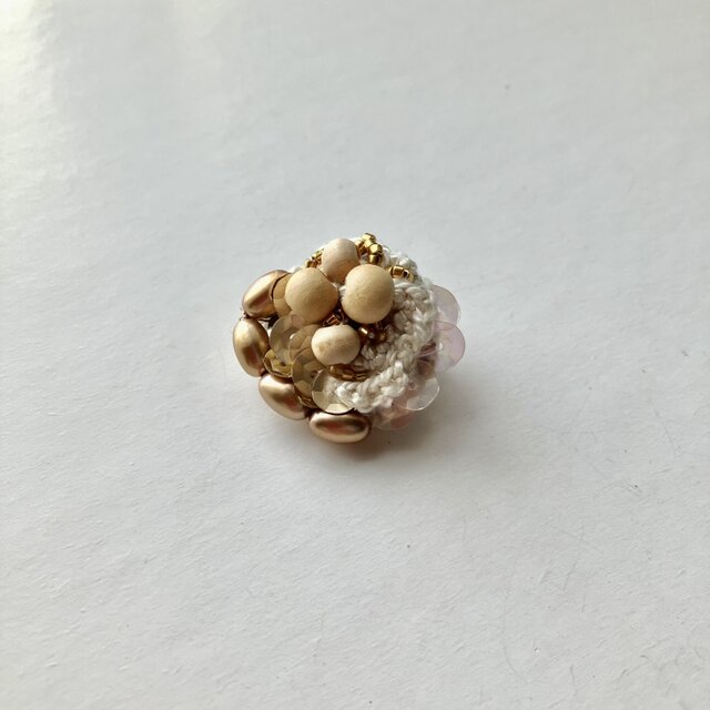 全体に、ナチュラルなベージュ糸を編み合わせ、刺繍をし形を作っています。右側には、透明感のあるピンク色のスパンコールをそっと添えました。