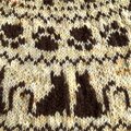 遊びに使うヒモとボールからイメージした模様と、足跡、茶猫を編み込みました。